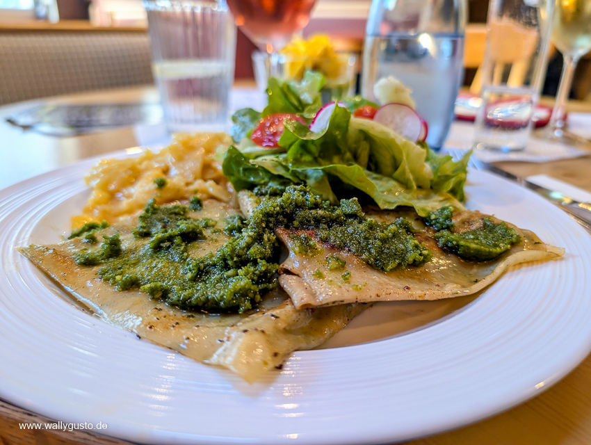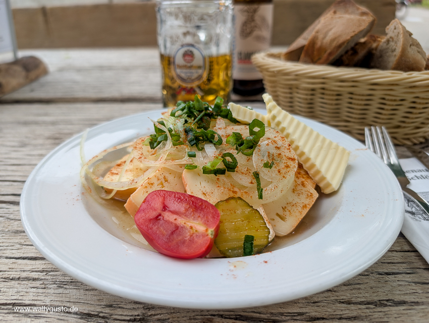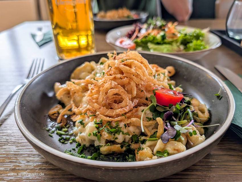 Auf unserer ersten Etappe kehren wir zum Mittagessen im Biergarten vom Gasthaus zum Schlößle ein. Die Speisekarte bietet eine große Auswahl an vegetarischen und veganen Gerichten, wie Spätzle mit Pilzrahmsoße oder Gerstengraupen-Risotto. Herr Wallygusto und ich haben die Qual der Wahl und entscheiden uns letzten Endes beide für den Backsteinkäse mit Musik.