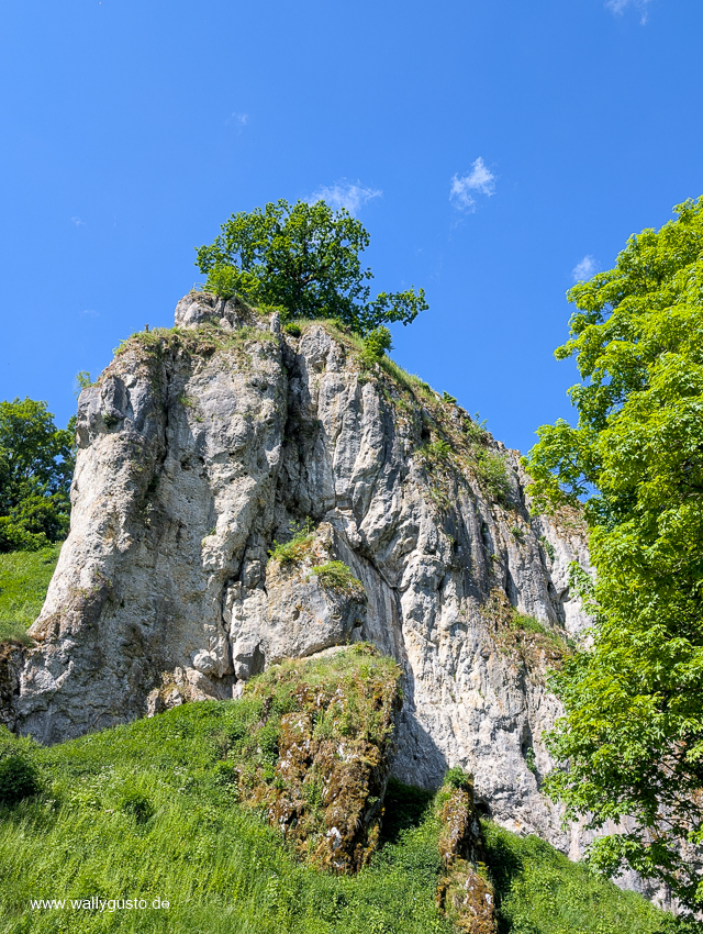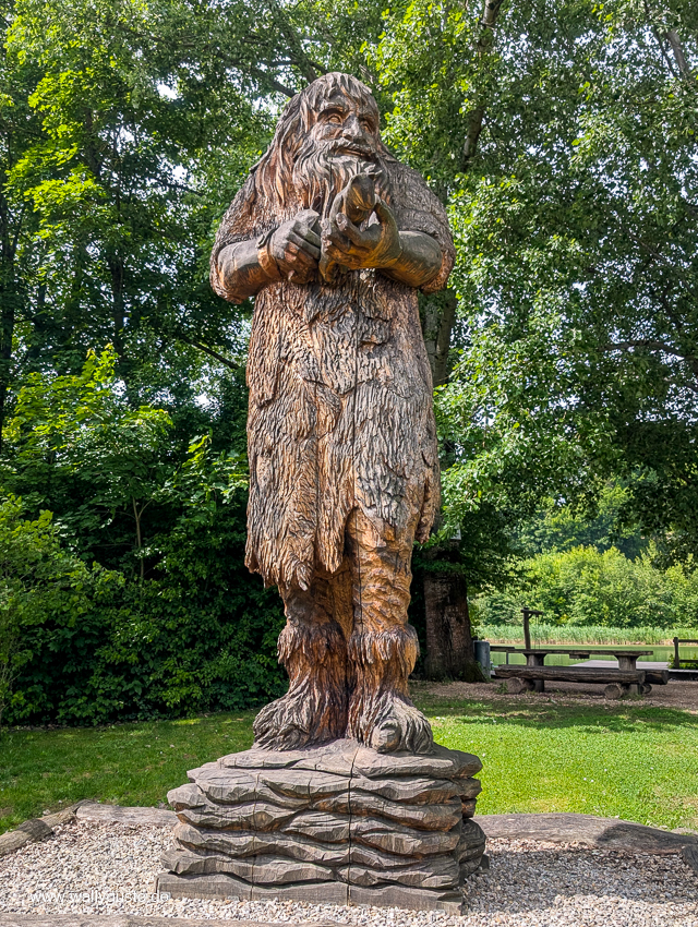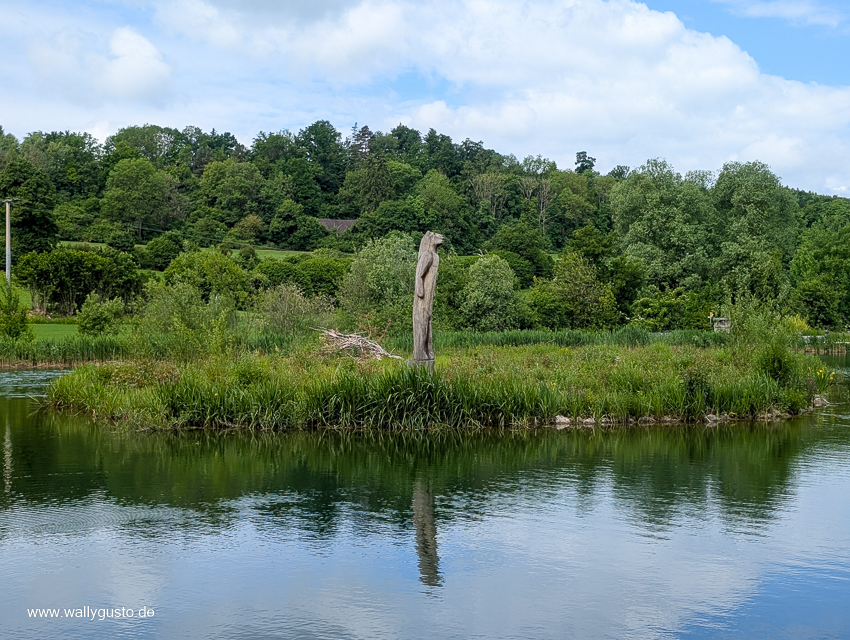 Von Amstetten geht es ins beschauliche Lonetal. Dort gab es zahlreiche steinzeitliche Funde aus der Zeit der Neandertaler, darunter auch den berühmten Löwenmensch aus Elfenbein. Die Skulptur „Steinzeitmensch schnitzt Löwenmensch“ am Lonesee soll den Prozess der Entstehung dieser Tier-Mensch-Figur darstellen. An Felsformationen und Höhlen wie dem Mehlsackfelsen und dem Fohlenhaus vorbei geht es weiter nach Giengen, dem Ziel unserer 1. Etappe.