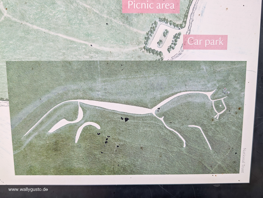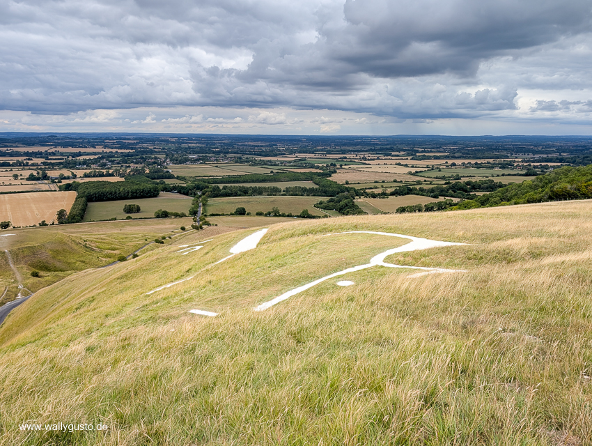 In den North Wessex Downs in gibt es acht riesige weiße Pferdefiguren, die in die Kreidehügellandschaft gehauen sind, aber das prähistorische White Horse von Uffington ist das Bekannteste. Schon als Kind habe ich davon geträumt, diese Pferdefigur zu besuchen, denn Pferde waren damals meine große Leidenschaft. Zum Glück ist Herr Wallygusto für vorgeschichtliche Sehenswürdigkeiten immer zu haben, so dass es kaum Überredungskünste bedarf. Der Parkplatz ist schnell gefunden und von dort führt uns ein einfacher Weg hinauf zur Pferdefigur und zur Wallanlage des Huffington Castle.