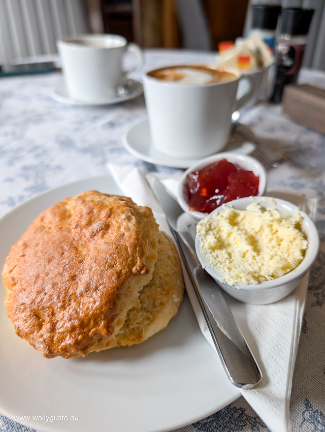 In einem hübschen Dorf namens Aldbourne entdecken wir das Time at the Forge. Das gemütliche Café befindet sich im 1. Stock einer Bücherei und hat einen ganz besonderen Charme, denn alles ist ein bisschen krumm und schief. Die Scones mit Clotted Cream Erdbeermarmelade sind richtig lecker. Der Flat White hat allerdings viel Luft nach oben. Vielleicht hätte ich doch einen schwarzen Kaffee bestellen sollen, der laut Herrn Wallygusto einer der besten des Urlaubs ist.