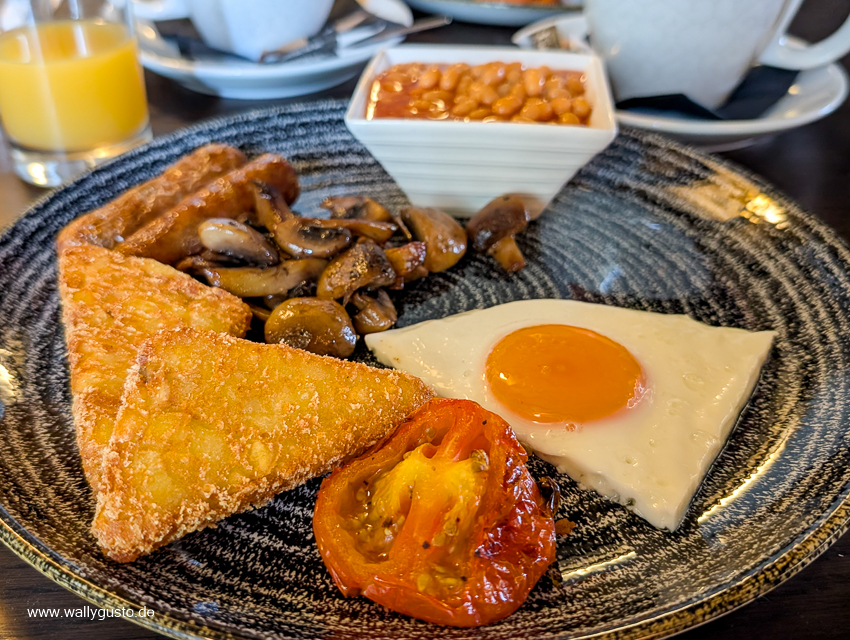 Zum Abendessen bleiben wir im Pub und bestellen vegetarische Burger. Die sind zwar nicht mehr so lecker, wie wir sie in Erinnerung hatten, aber wir hatten schon weit schlechtere. Dazu probieren wir uns munter durch das Angebot an Fassbieren. Zum Frühstück wird English Breakfast serviert und das erfreulicherweise auch mit veganen Würstchen (die übrigens fantastisch sind).